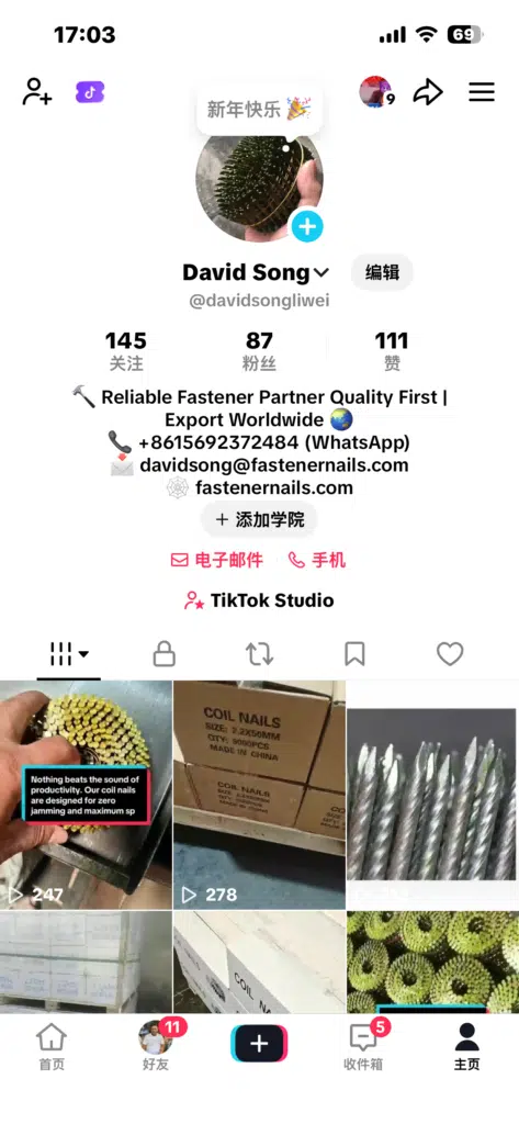 Coil nails packing list showing box sizes, inch specifications, and quantity per carton
